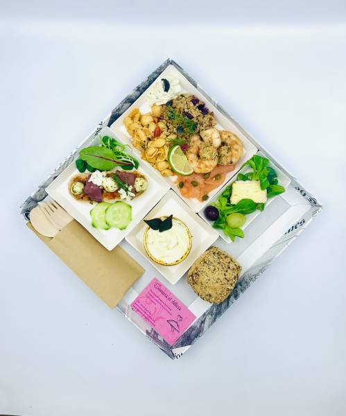 * Gambas marinées et cuits à la plancha, lamelles de saumon fumé et crémeux aux échalotes
