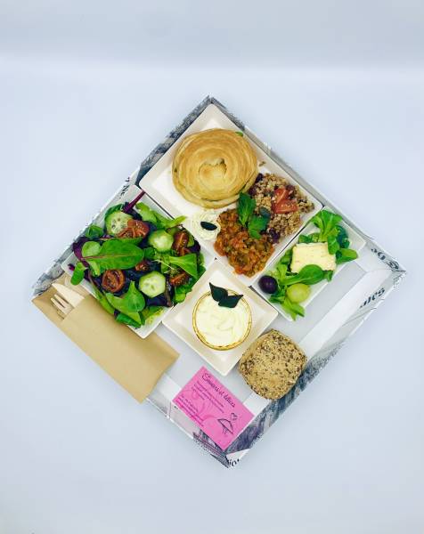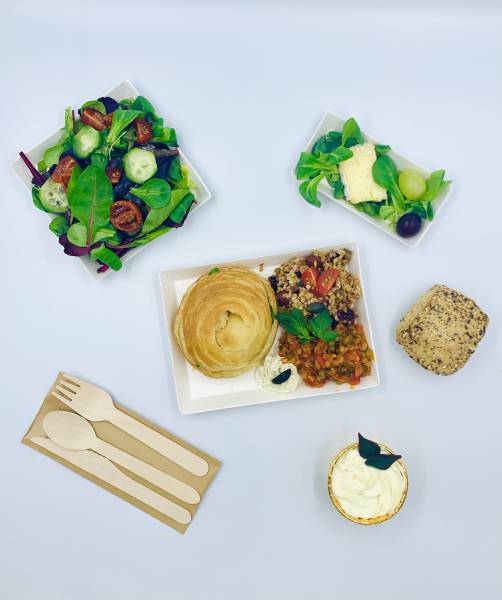* Pain croustillant façon pâte à croissant, petits légumes, billes de mozzarella au pesto, céréales et crémeux à la ciboulette
