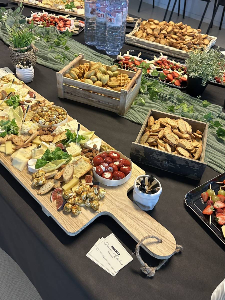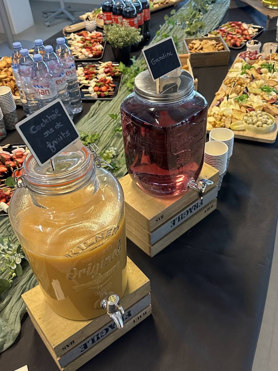 Si vous le souhaitez, nous pouvons préparer de grandes planches de fromages affinés, accompagnées de jarres de boissons fraîches, pour créer un buffet clair, pratique et convivial. Ces plateaux permettent aux convives de se servir facilement tout en profitant d’un moment de partage.